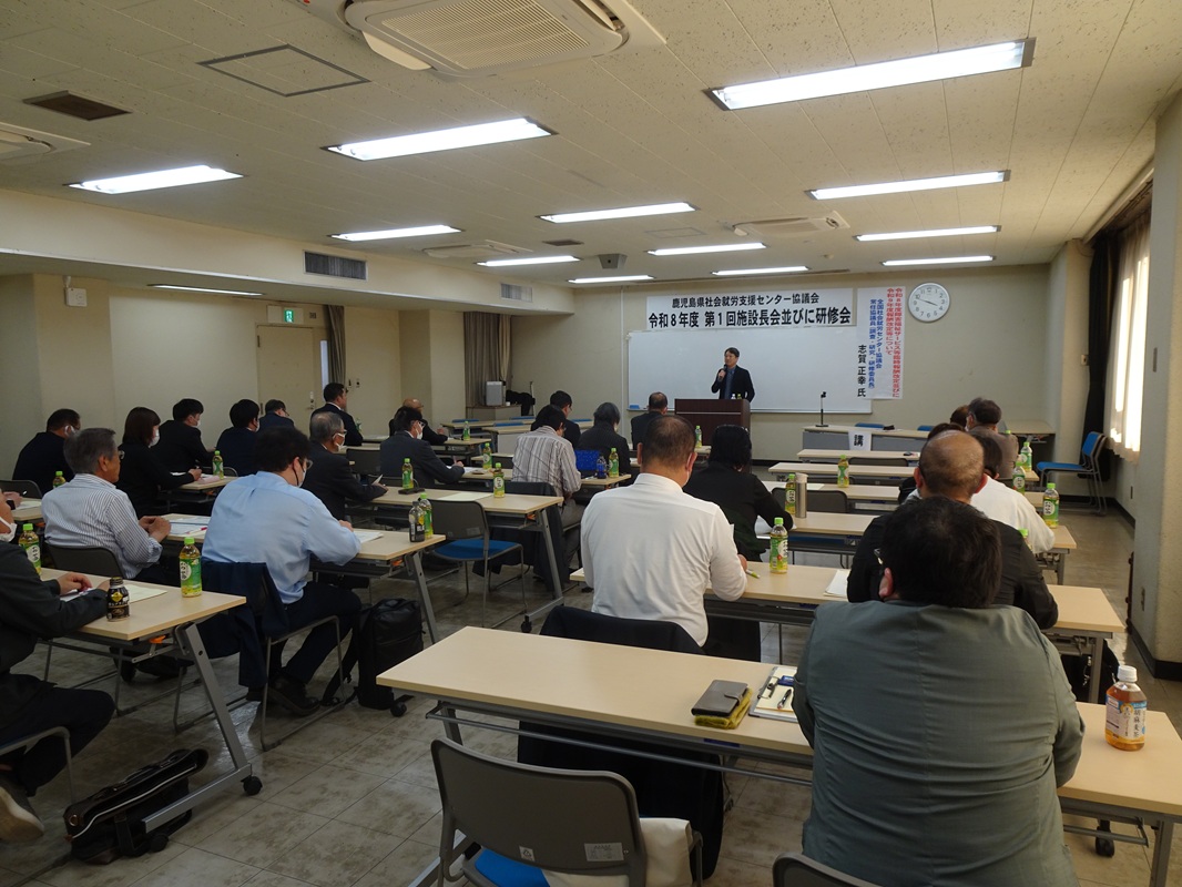 4月15日(水)、鹿児島県社会就労センター協議会の施設長会(総会)終了後、県社会福祉センター大会議室において、午後4時から施設長、職員等31名参加のもと総会時研修を開催しました。