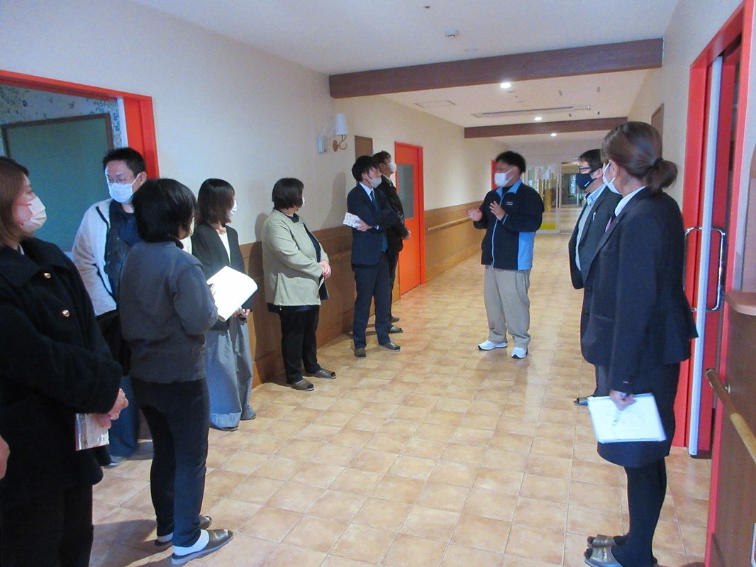 午前中は、La Plus9階のミーティングルームにおいて、同法人の川窪経営企画室長から法人の概要説明の後、3班に分かれ地域との交流を図る健康多目的室、室内運動場や天然温泉、ビアバル、ブックカフェ、子どもの遊び場等の他、福祉施設としてグループホーム等の視察を行いました。
